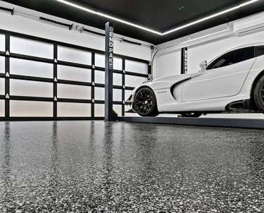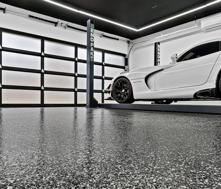 Full-flake epoxy floors built to resist Canadian winters, road salt, and hot-tire pickup.